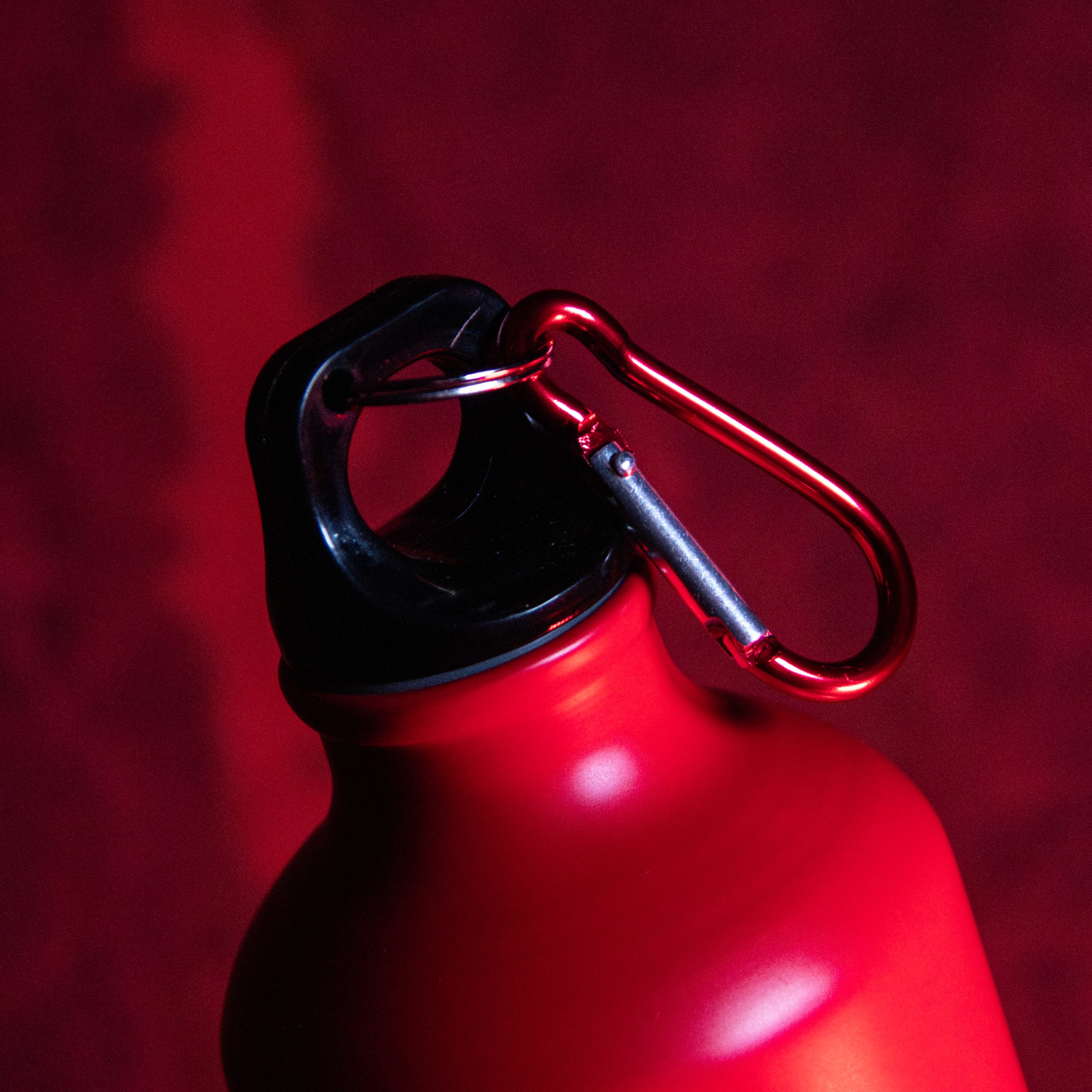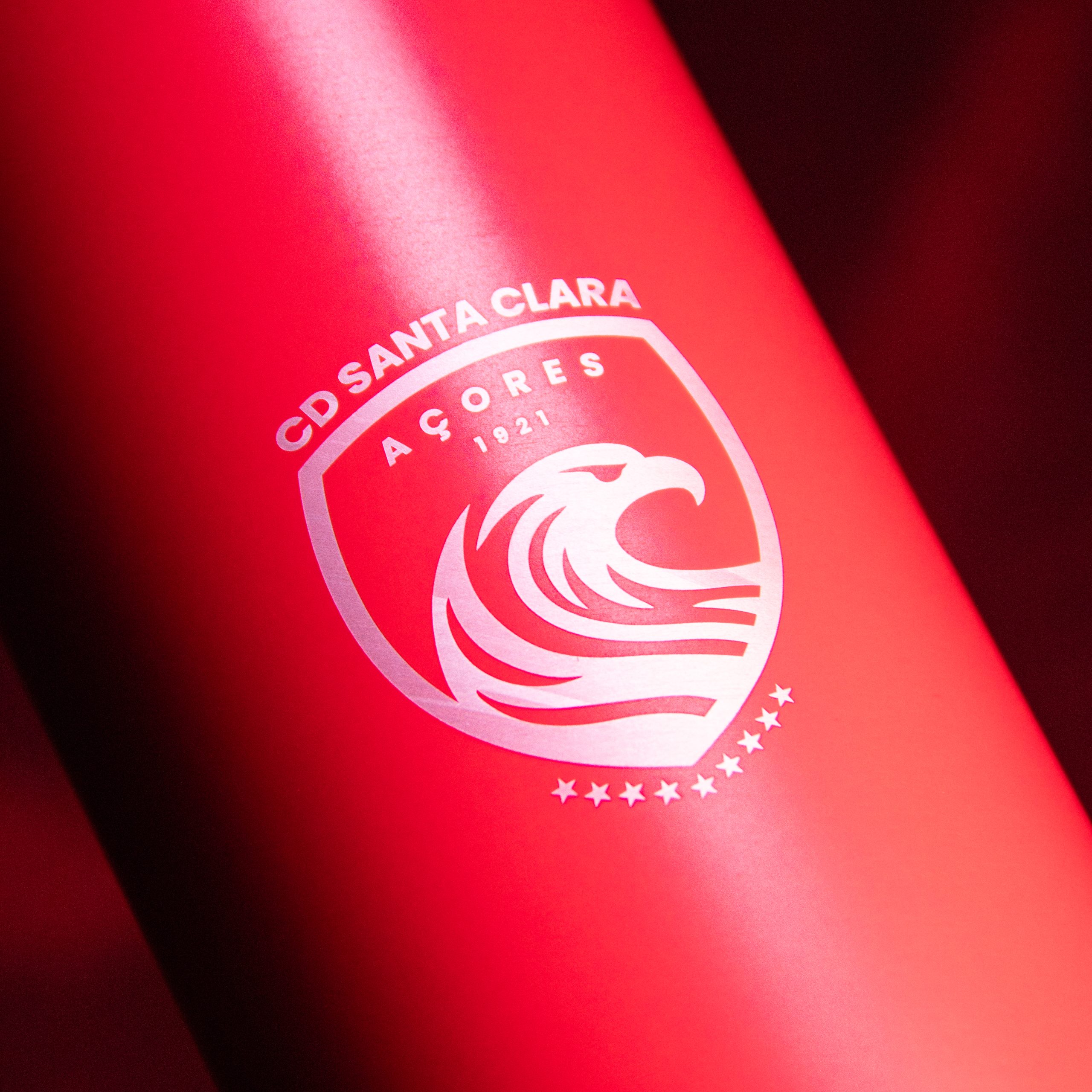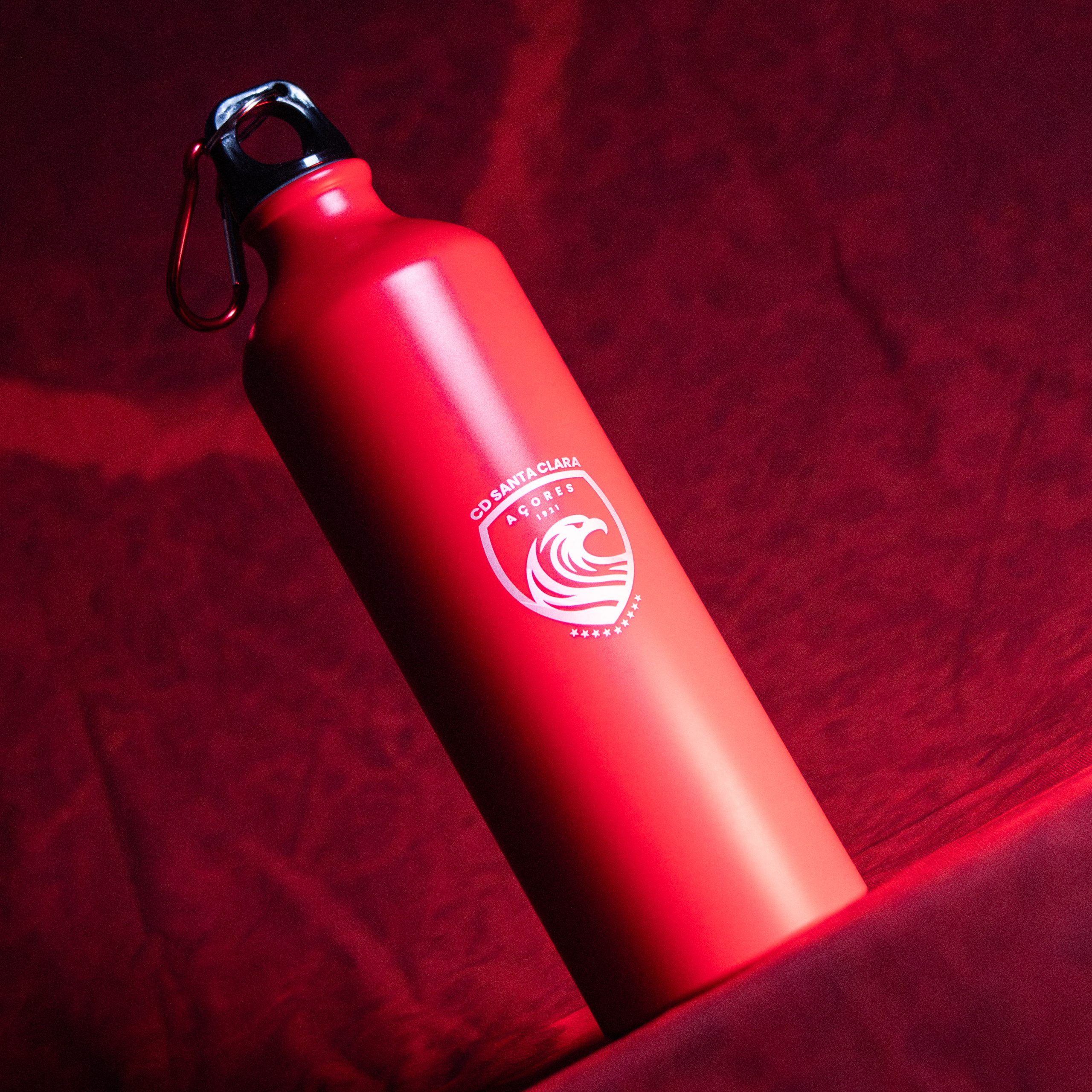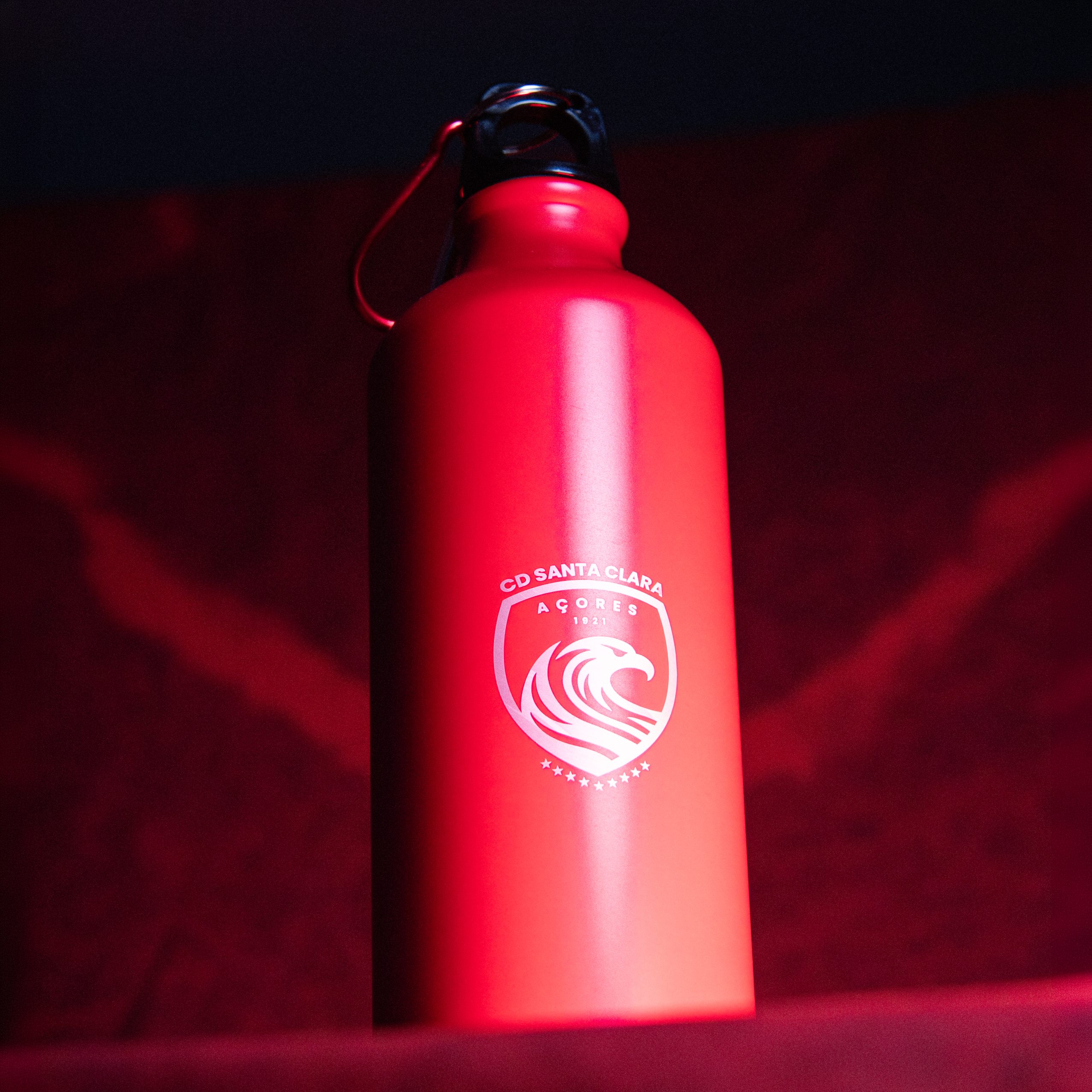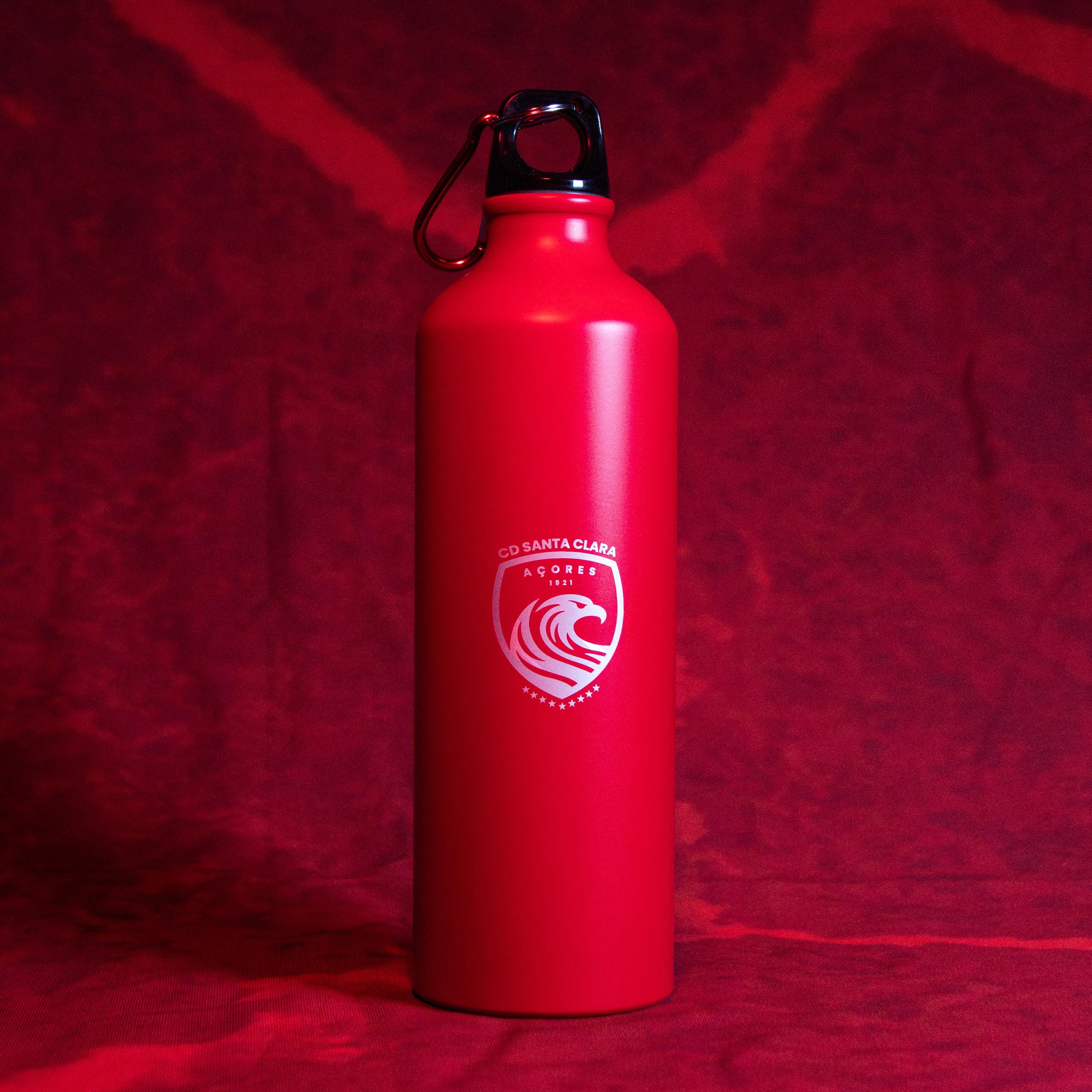 Garrafa metálica vermelha com emblema Santa Clara. Leve, resistente e perfeita para o dia a dia. Produto licenciado.